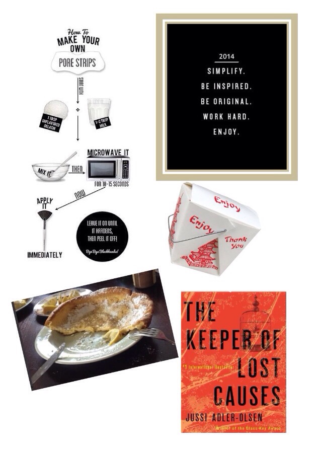 Happy 2014 everyone! I hope that you had a fun and safe NYE, and that you spent the first day of 2014 doing something that makes you happy. I opted for an at home spa day and couldn’t be happier with my choice. I started with a face scrub made of coffee grounds, yogurt and coconut oil, and I got the recipe from this pin. Then I made a mask of gelatin and milk, which is essentially a giant pore strip, and that came from this pin. I finished off my at home spa day with a detox bath. There are a ton of different detox baths out there, but I kept it simple –with this one— and used lavender Epsom salts and baking soda, and the result…glorious relaxation. The day also included breakfast with our next door neighbors and a Dutch Baby demonstration, serious lounging, the start of a new book and Chinese takeout.