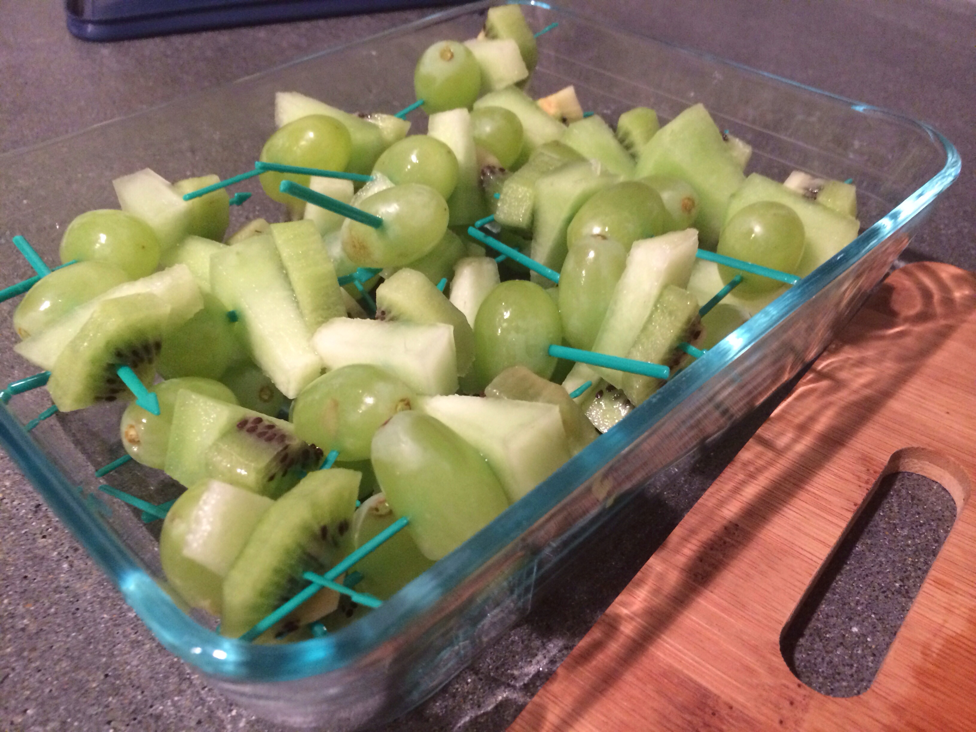 And, I was boring. I brought some of the mimosa fixin’s but also these little fruit skewers, with honeydew, kiwi, and green grapes.